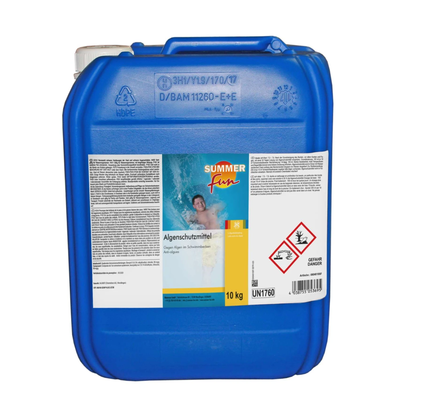 Das vorbeugende 10 Liter schaumarme Algenschutzmittel von Summer Fun hilft gegen Algenwachstum im Pool.