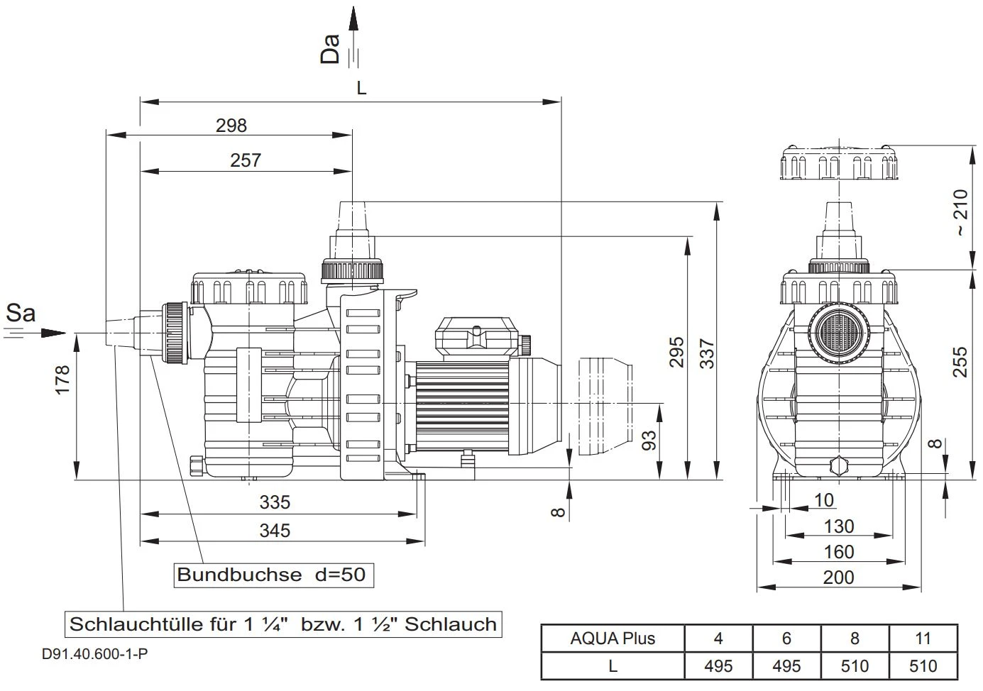 Schwimmbadwasser-Umwälzung in Filteranlagen, aufstellbar max. 2 m oberhalb oder max. 3 m unterhalb des Wasserniveaus.