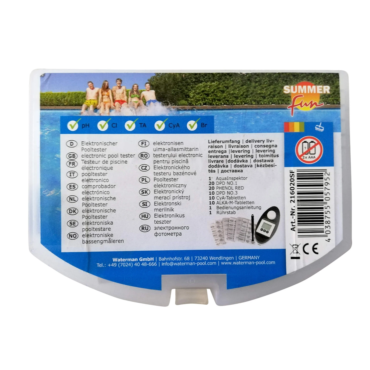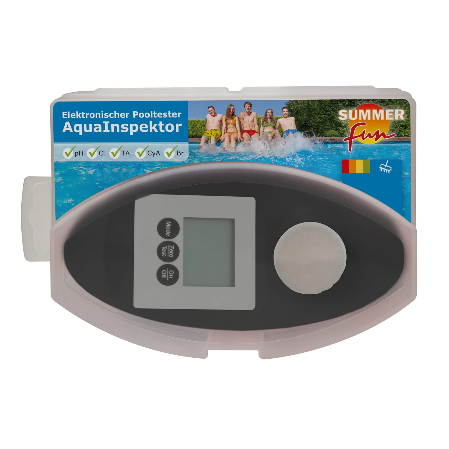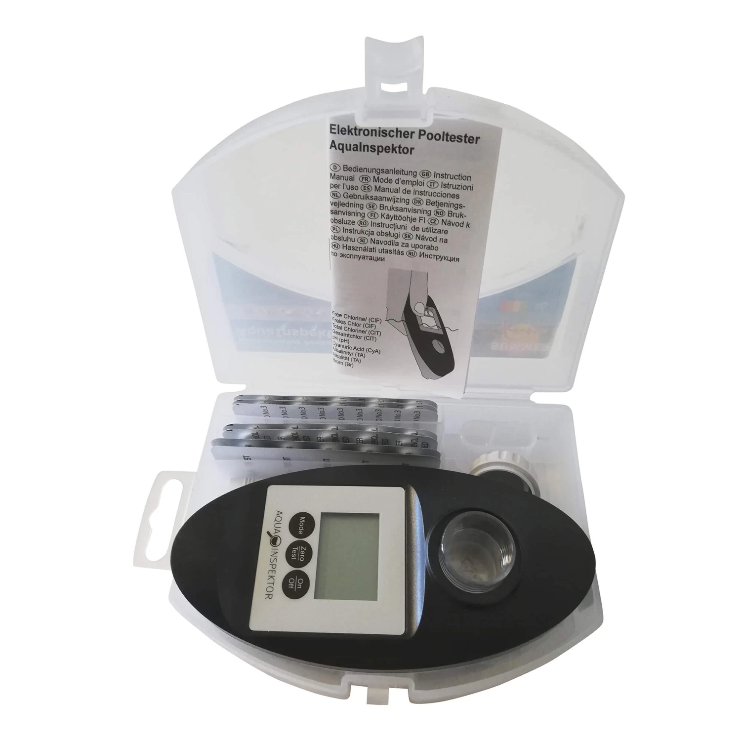 - pH: pH-Indikator (Phenol Red Photometer) – gibt den pH-Wert Ihres Schwimmbadwassers wieder