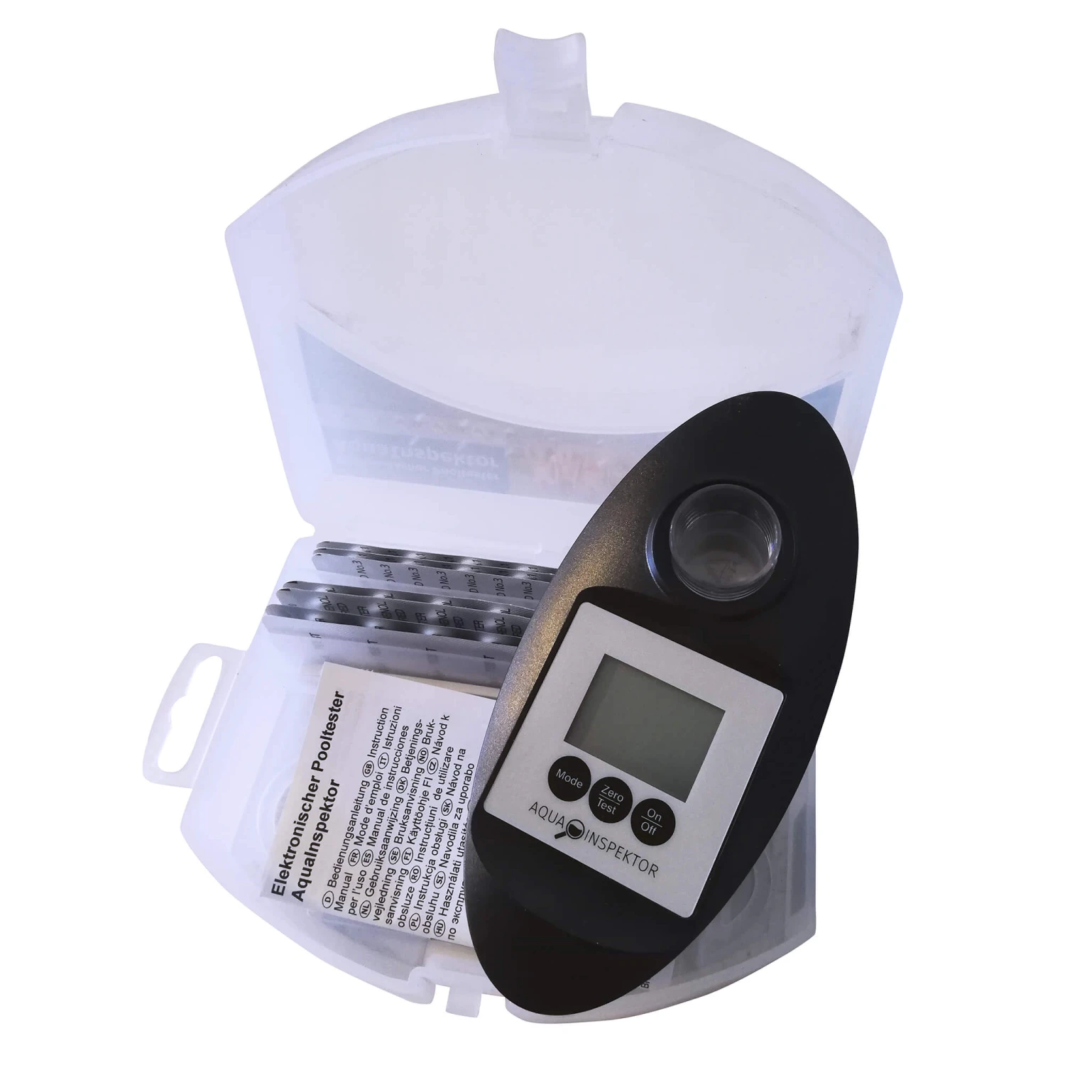 Der Tester ist ein batteriebetriebenes Messgerät, das bestimmte Wasserinhaltsstoffe