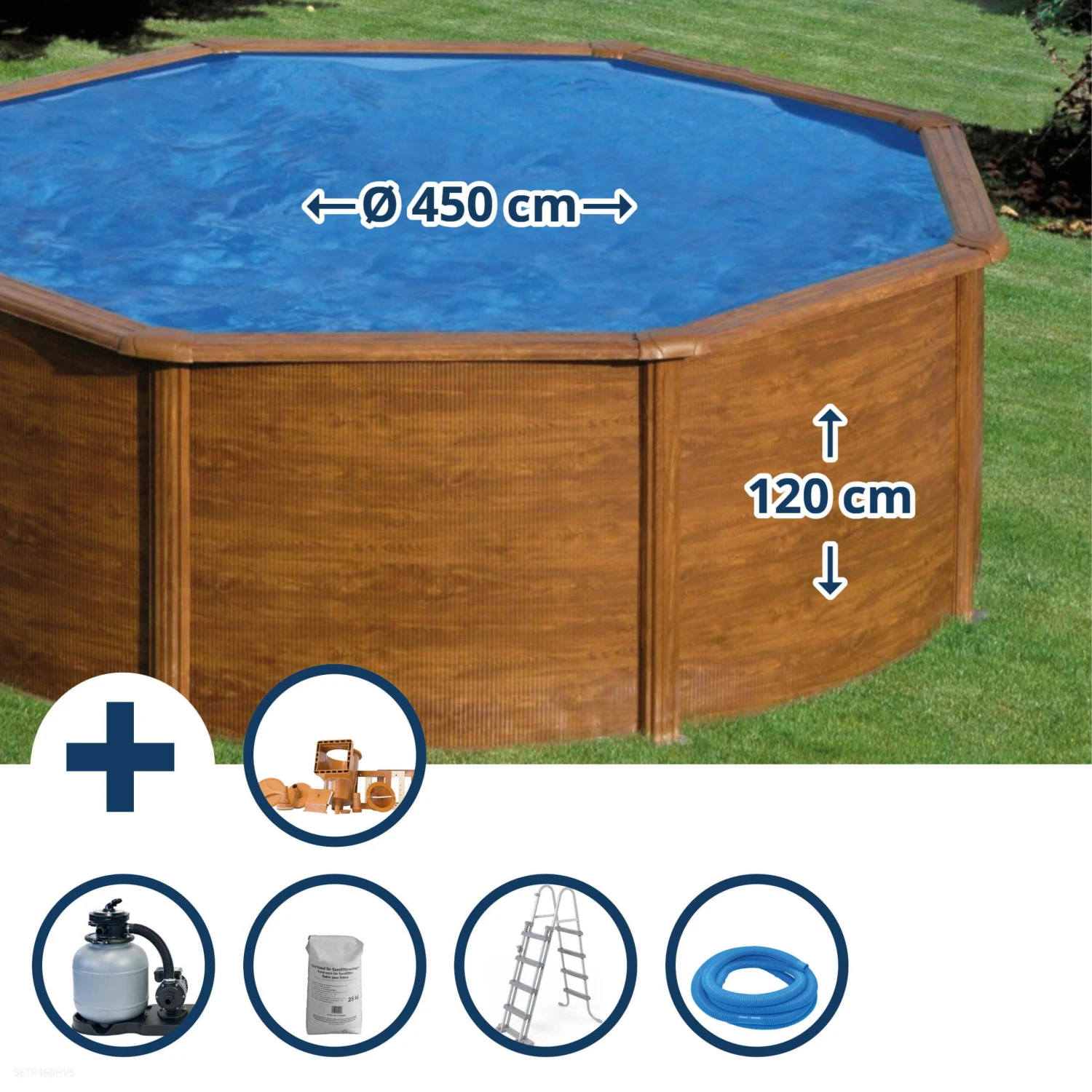 Dieser Rundformpool hat die Maße 450 x 120 cm und die Außenfarbe Holzoptik.