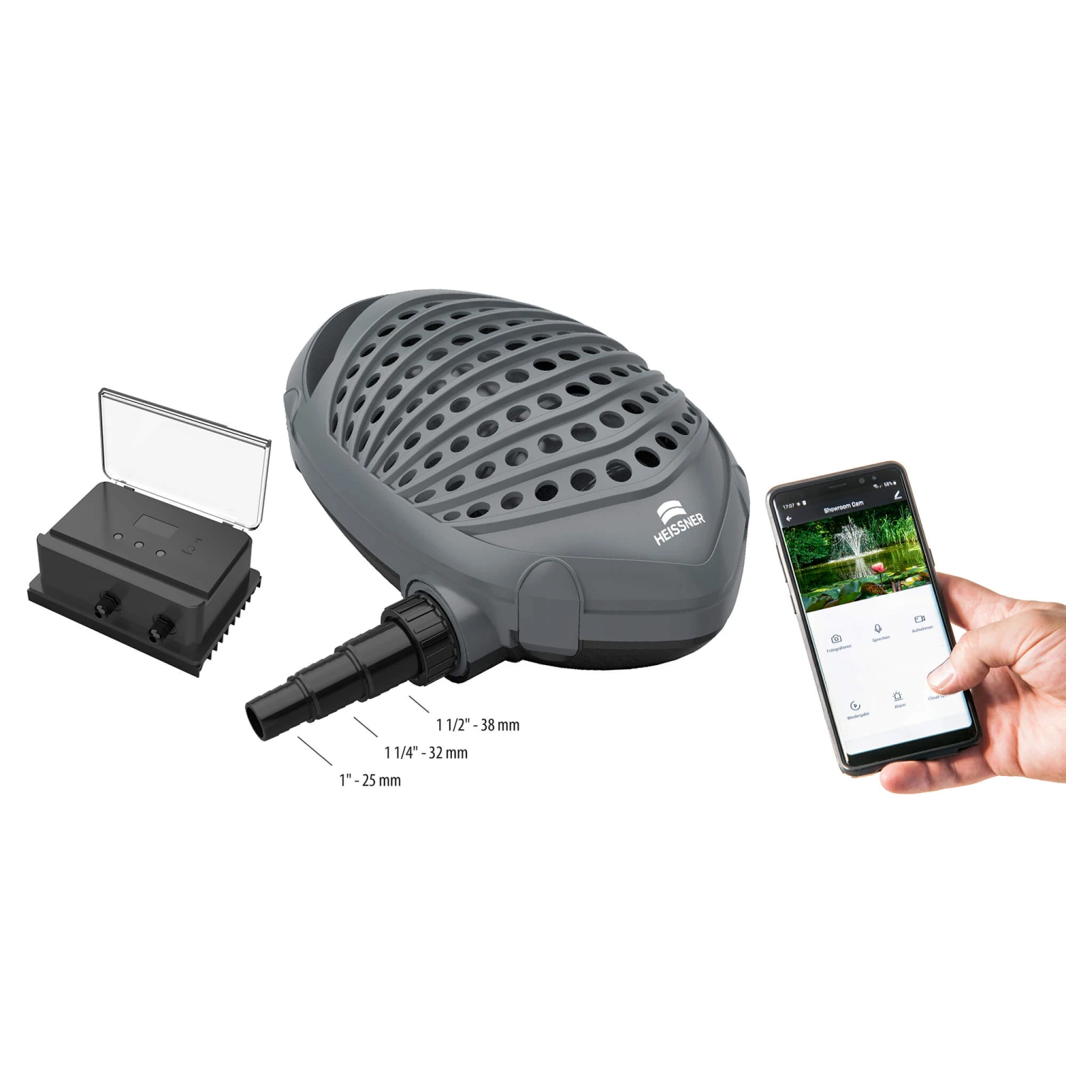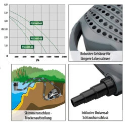 Die neue Heissner Aqua Craft Smart Serie inklusive externem Controller zur Steuerung und Anpassung der Förderleistung. Das robuste Gehäuse sorgt für eine lange Lebensdauer der Teichpumpe und lässt Schmutzpartikel bis 10mm Größe durch. Der im Lieferumfang enthaltene Schlauchanschluss hat 3 Abstufungen, so kann ein Schlauch mit einem Durchmesser von 25 – 38 mm (1″ – 1 1/2″) angeschlossen werden.