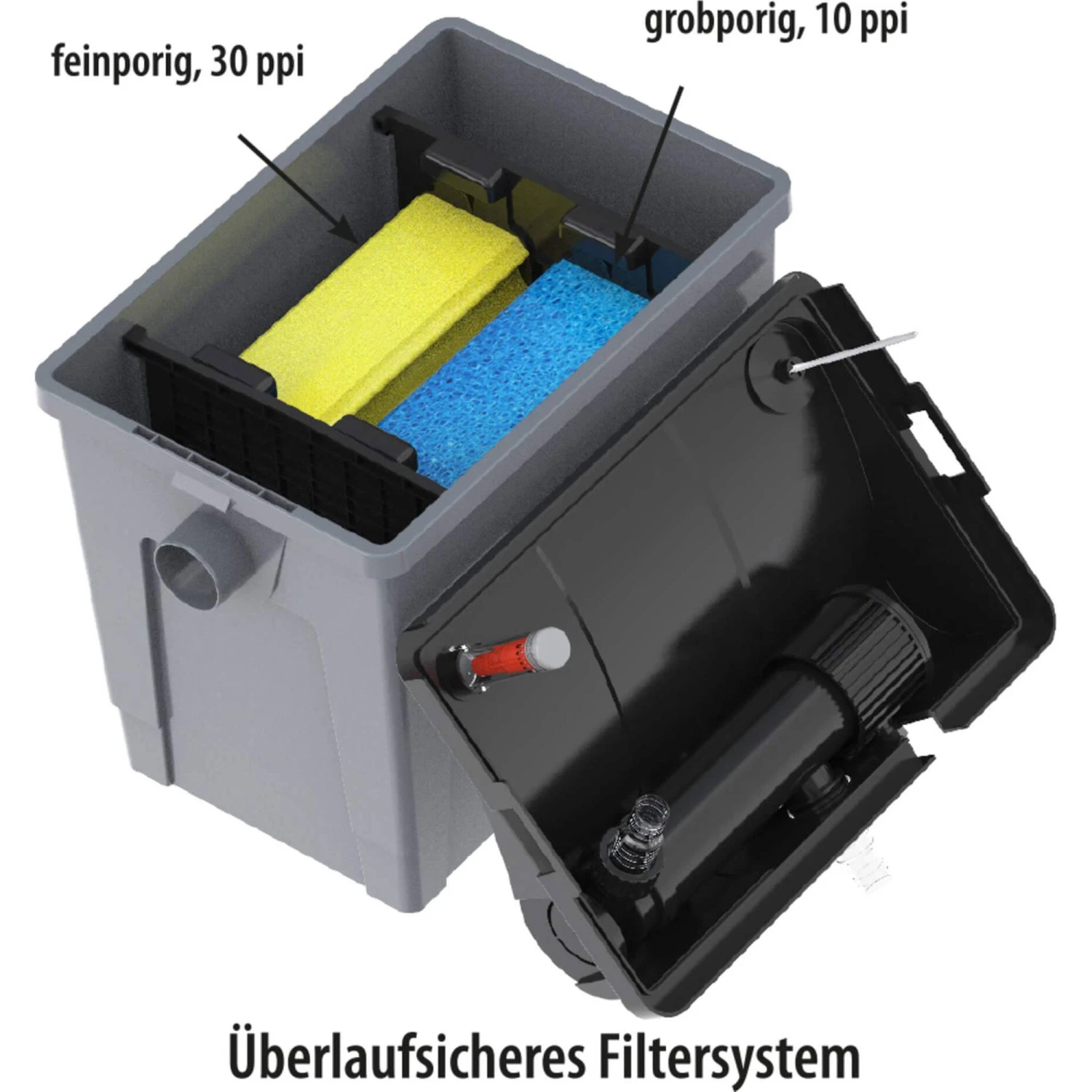 und wird inklusive hochwertigen Filtermedien, kraftvoller ECO-Pumpe (3.300 l/h, 40 W), UVC-Klärer (9 W), 5 m Schlauch und Zubehör geliefert. Beim Kauf eines HEISSNER-Filters FPU10100-00 bekommst du zusätzlich unser Klarwasser-Versprechen oberdrauf! Das bedeutet: Klares Wasser oder Geld zurück!