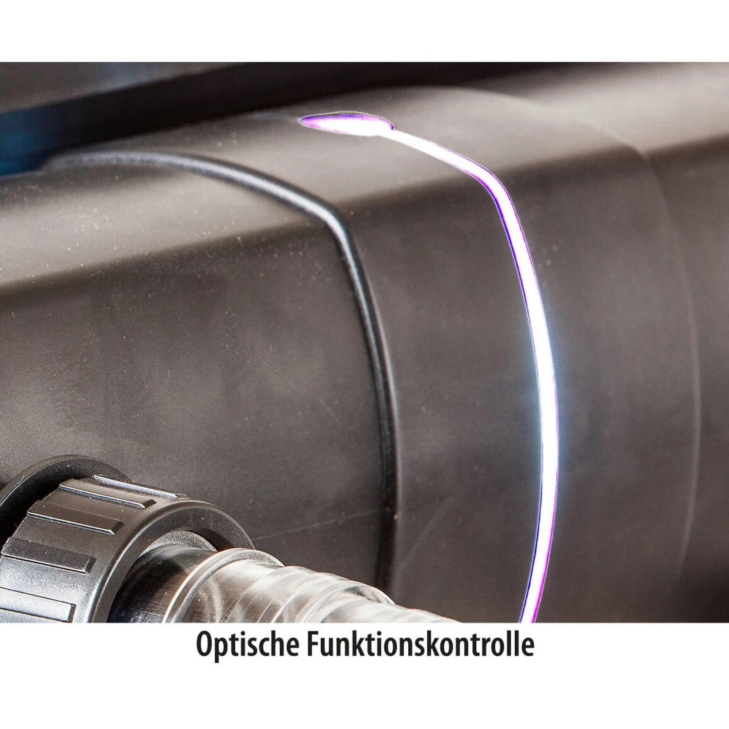 Die Teichfilteranlge ist für Gartenteiche bis 16.000 Liter geeignet und hemt, durch den integrierten 18 Watt UVC Klärer, die Verbreitung von Schwebealgen. Auch Bakterien, Keime und Fischparasiten werden durch die ultraviolette Strahlung bekämpft. Die Leistung der UV-C Lampe läßt nach ca. 8.000 Betriebsstunden nach, daher sollte diese dann spätestens gewechselt werden. Um die optimale Leistung zu gewährleisten empfiehlt sich jährlich ein Wechsel der UV-C Lampe.