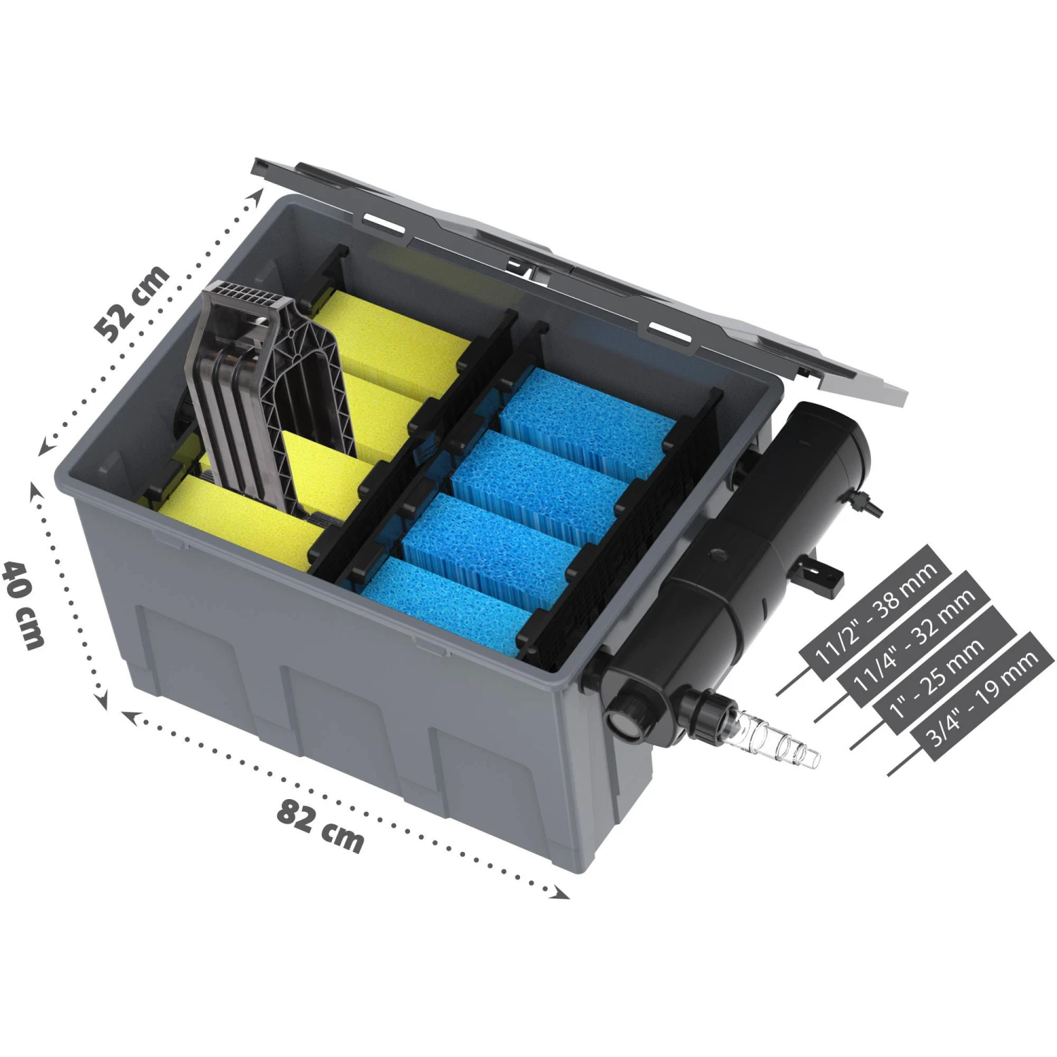 - Durchlauffilter inkl. Filtermedien (FilterschwÀmme und Biokugeln)