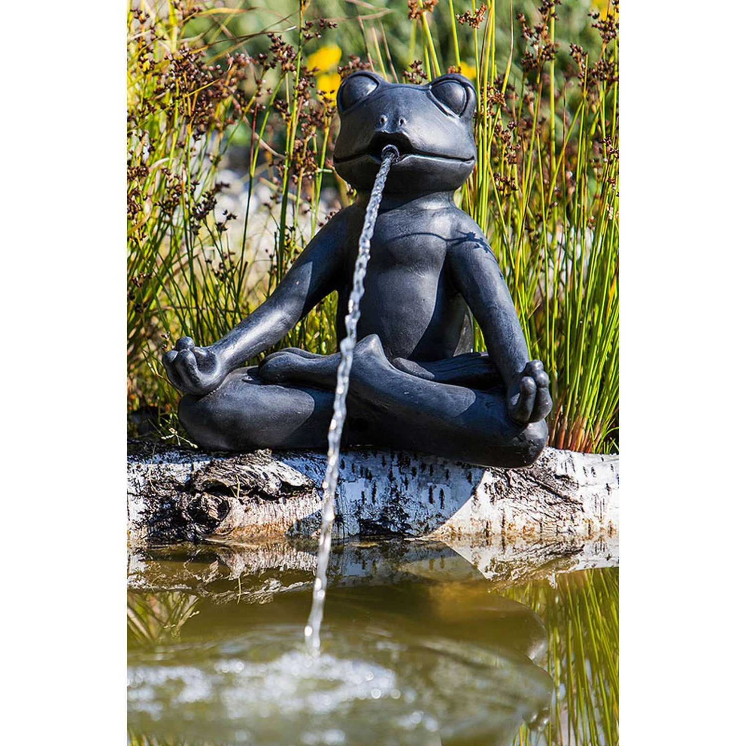 Die neuen edlen HEISSNER Yoga-Teichfiguren sind anthrazit-farben und aus hochwertigem, dauerhaft-wetterfestem Polyresin-Material gefertigt.
