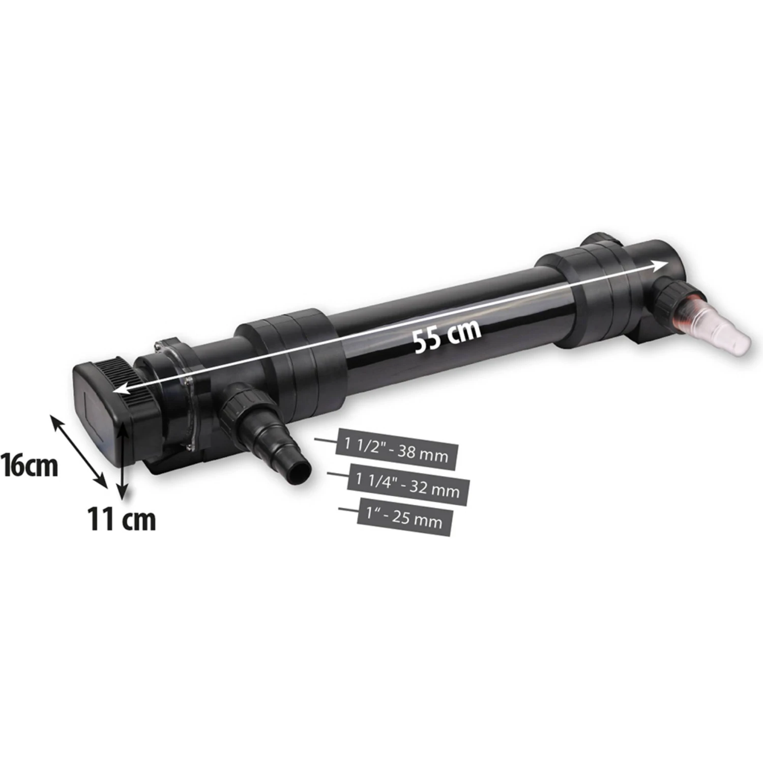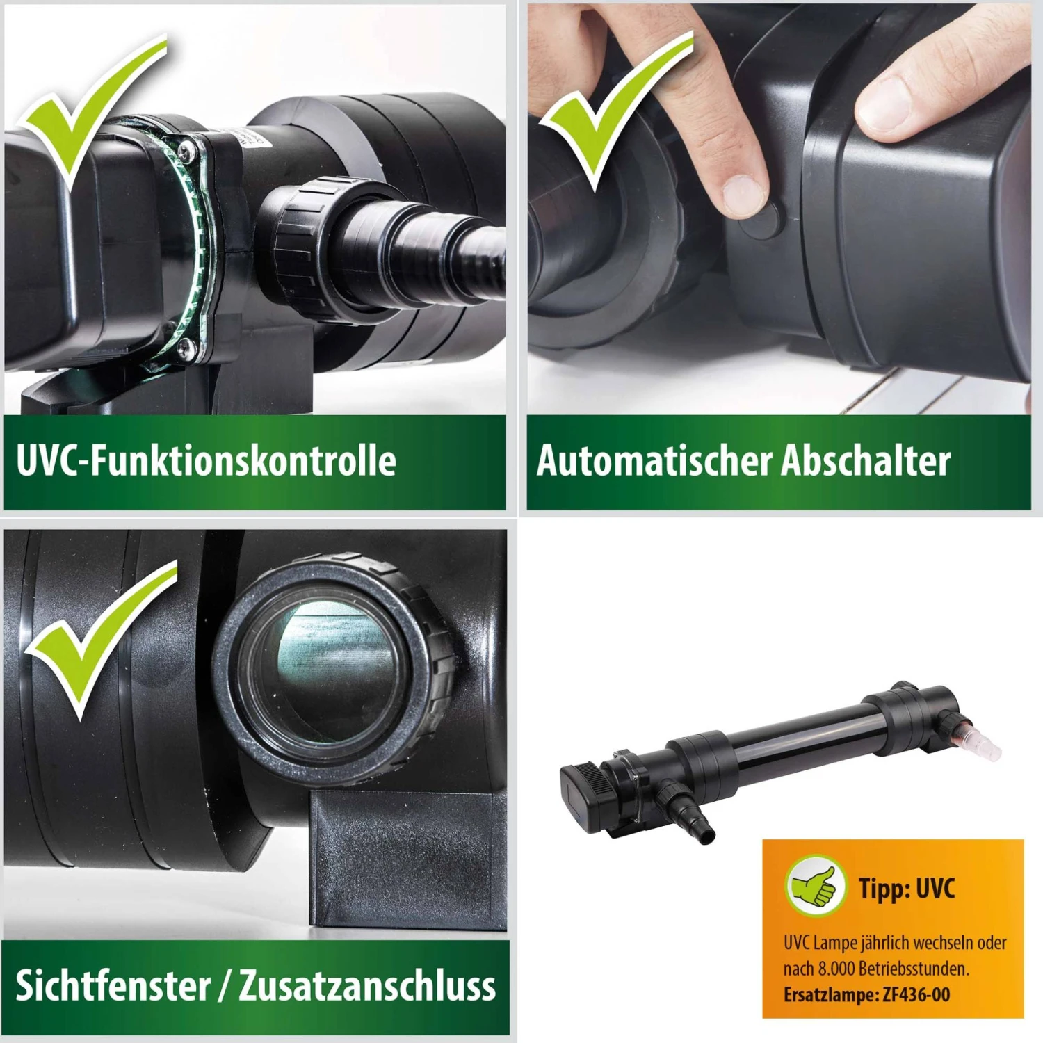 - Tipp! Je 1.000 Liter Teichwasser ca. 1 W UVC-Leistung kalkulieren