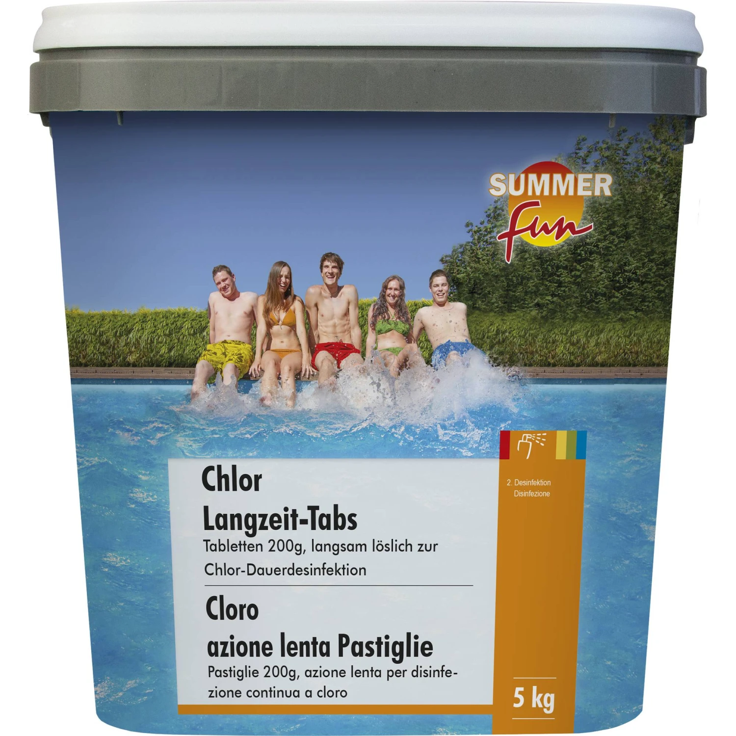 Die 200 Gramm Chlor Langzeit-Tabs von Summer Fun bestehen aus einer organischen Chlorverbindung mit Aktivchlor. Die Tabletten sind langsam und rĂŒckstandsfrei löslich und wirken in UnabhĂ€ngigkeit von der WasserhĂ€rte. Die Tabletten sind einzeln eingesiegelt zur leichteren Handhabung. Die perfekte Lösung zur Dauerchlorung wĂ€hrend der Poolsaison.