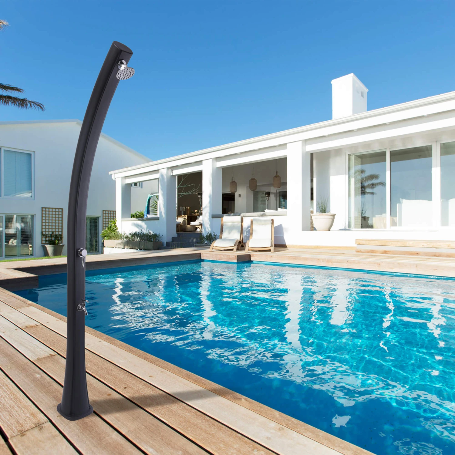Installiere einfach eine unserer schicken Solar-Gartenduschen in der Nähe deines Schwimmbeckens. So kannst du warmes Wasser ganz ohne Stromverbrauch genießen. Denn das Wasser wird hier einfach durch die Kraft der Sonne erwärmt.