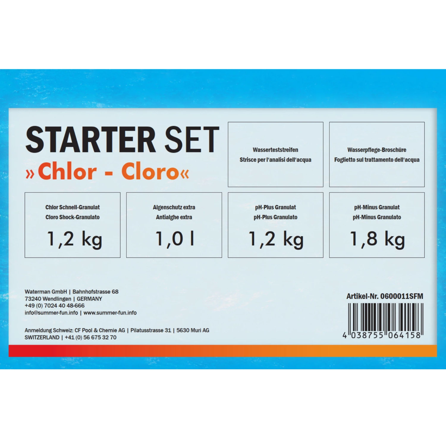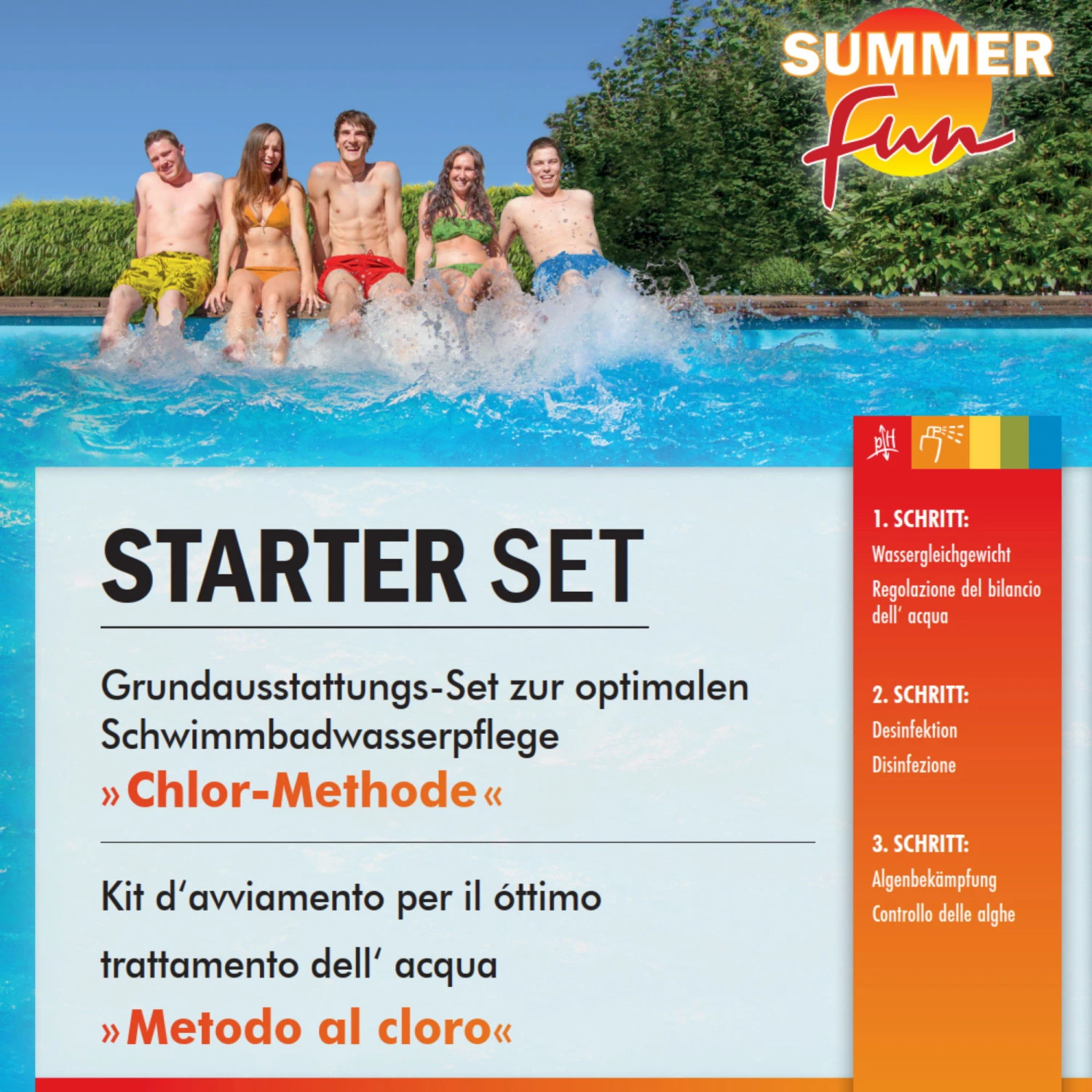 - ​Wasserpflege als Komplettset – ideal als ErstausrĂĽstung fĂĽr Einsteiger, das Chlor-Starter Set von Summer Fun!
